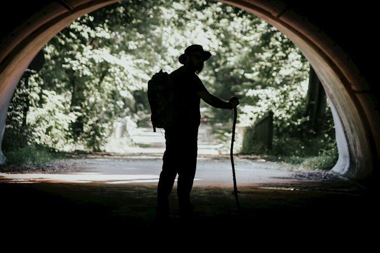 Reifschneider snapped a photograph of a man's silhouette standing under a bridge in front of a path framed by trees. The darkness surrounding the figure in the foreground contrasts with the brightness beyond the bridge. The figure glances back to the camera, carrying a backpack and walking stick, as if on a journey toward the light.